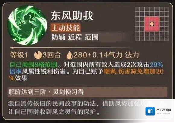 东风助我(主动技能):,作用范围8格,对所有敌人造成两次风属性锐利伤害,攻击倍率为29%,并附带嘲讽效果,使敌人转而集中攻击自己,同时获得20%的伤害减免。