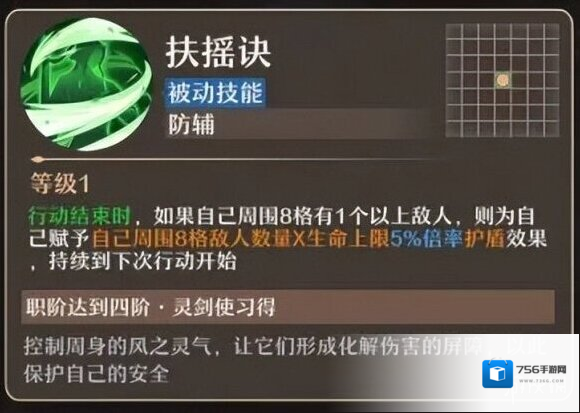 扶摇诀:回合结束时,若8格范围内存在两个或以上敌人,技能将生成一个护盾,其强度由周围敌人数量乘以生命上限的5%决定,该护盾将持续至下次行动开始。