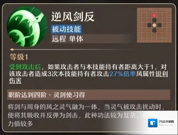 逆风剑反(被动技能):在遭受攻击时,若攻击者与技能持有者的距离超过一定界限,技能持有者将反击以3次风属性锐利伤害,伤害倍率为27%。