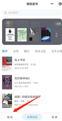 2、进入微信读书小程序后,我们能看见最下面有一个福利的选项,我们选择这个选项。