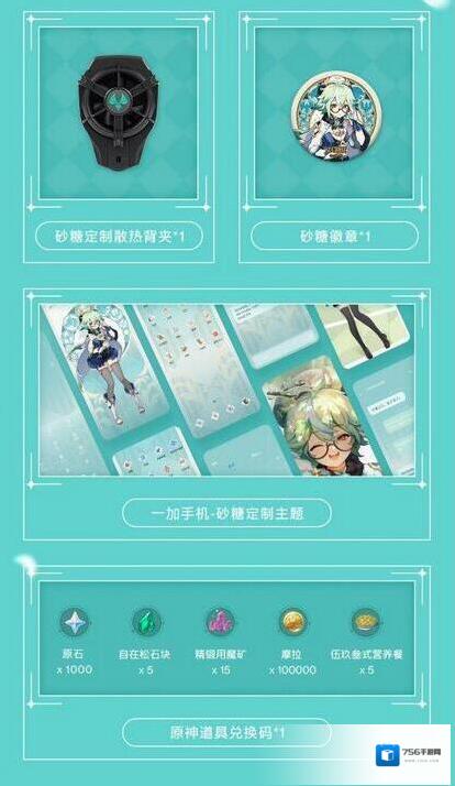 1.图中句式一加与原神联动的手机,采用的砂糖同色的青空色系,并且同时有砂糖定制手机壳以及一张砂糖的海报、背夹和徽章