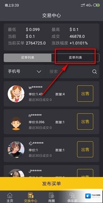 步骤二:点击买单列表,选择合适的买家或者用手机号搜索特定买家,确定买家之后点击该买家后方的出售。
