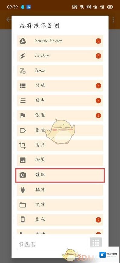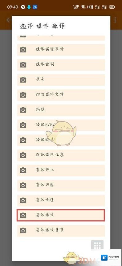 7、在选择媒体界面选择音乐播放操作,手机进入充电就播放充电提示音乐;