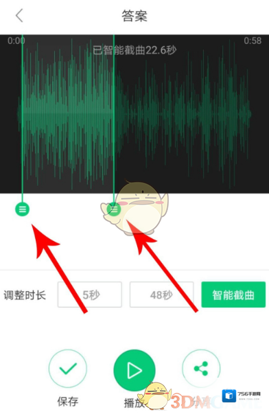 5、打开剪辑页面后,可以通过拖动两个滑块来截取想要的铃声段,位置见下图