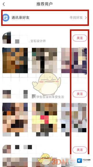 4、进入后即可添加通讯录好友,也可在下方推荐中选择感兴趣的用户点击关注添加好友。