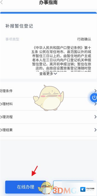5、进入补报暂住登记,查看办事指南,点击左下角的在线办理进入