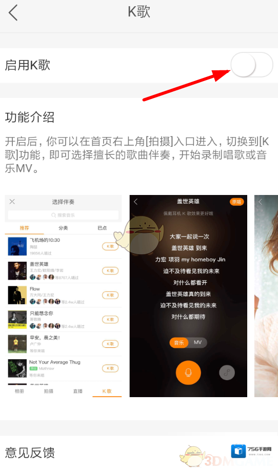 3、通过快手实验室里的“k歌”功能,大家就能够点击右侧按钮直接“启用k歌”,这样在拍摄页面的右下角就能够找到新增的k歌功能了。