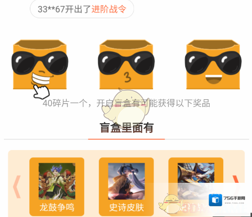 6、除了皮肤之外,还有现在很流行的盲盒的玩法,使用40碎片即可开启一个盲盒,打开盲盒可获得碎片及游戏道具等奖励;
