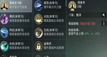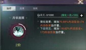 3.轻功强化:轻功强化分为伤害/治疗、效果、消耗三方面,强化一次消耗0w铜钱或培元丹,增加100真元。