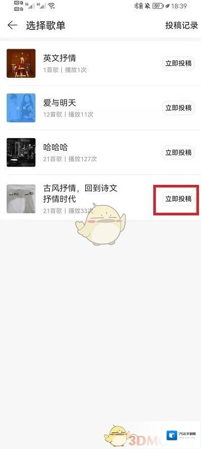 5、在分享界面中,我们需要选择自己想要分享的歌单,点击右边的立即投稿;