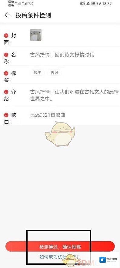 6、进入到投稿界面中,我们需要完成歌单的监测就可以点击发布了。