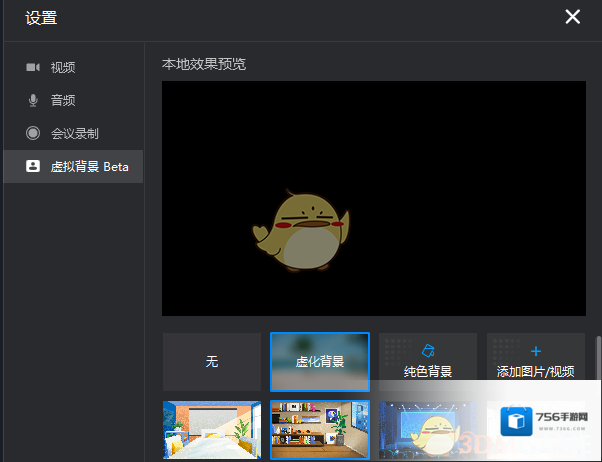 可通过电脑钉钉- 在视频会议中-右下角设置-更多设置-虚拟背景Beta-选择对应的虚化背景即可。