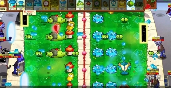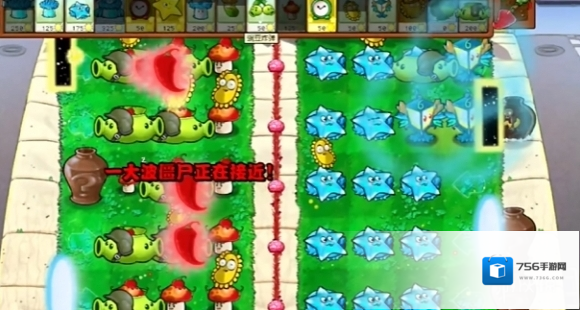 2、先在右侧一路种植一个寒冰星星,在左侧种植一个辣椒菇。