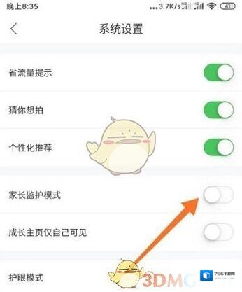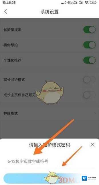 3、开启家长监护模式右侧的开关,输入监护模式密码,点击提交即可打开家长监护模式。