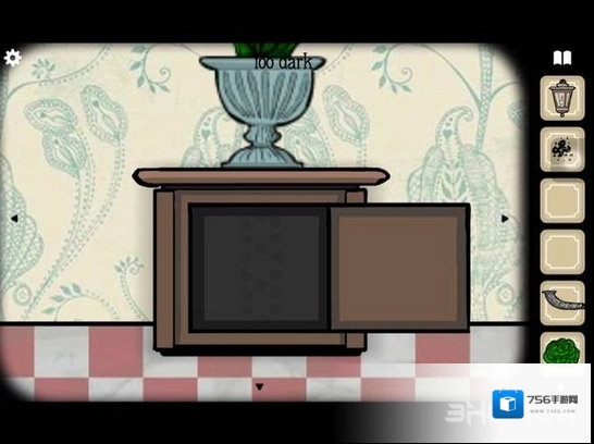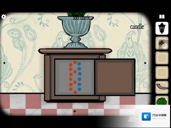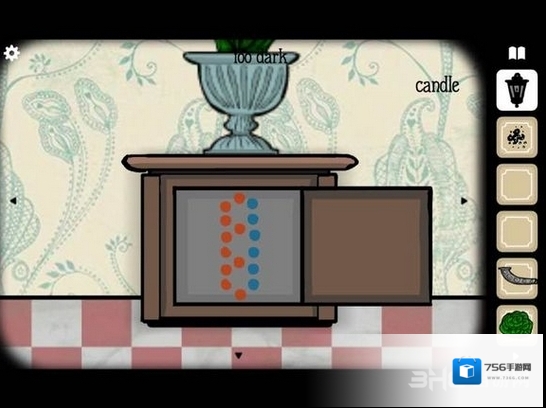 再给他吃一次热翔三明治,这次别给他厕纸,猴头里的钥匙先拿来开罂粟花那里的有盆景的柜子,发现里面有密码,但是太暗了。用一开始拿到的吊灯照亮获得密码。