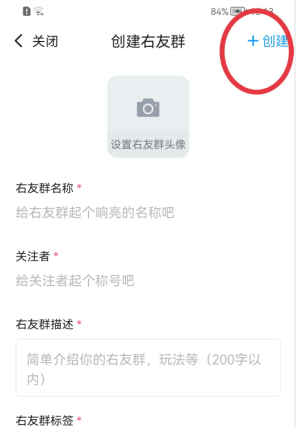 4、输入群名称、关注者、群描述后,点击+创建按钮,即可成功创建右友群。