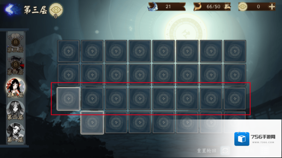 我个人推荐打它亮着的格子中间的那一行全打完,就是我用红色圈起来的部分,打完这一层全部格子然后用轮回之眼看一下,会更省,因为打完这一层格子,它上下两层格子就都是亮的,可以少用一些溯玉,也就是轮回秘境的行动点,俗称体力,因为溯玉不会自己回复,是需要在商城购买或者在日轮之城挑战和鸣之间解锁物品才可以获得。