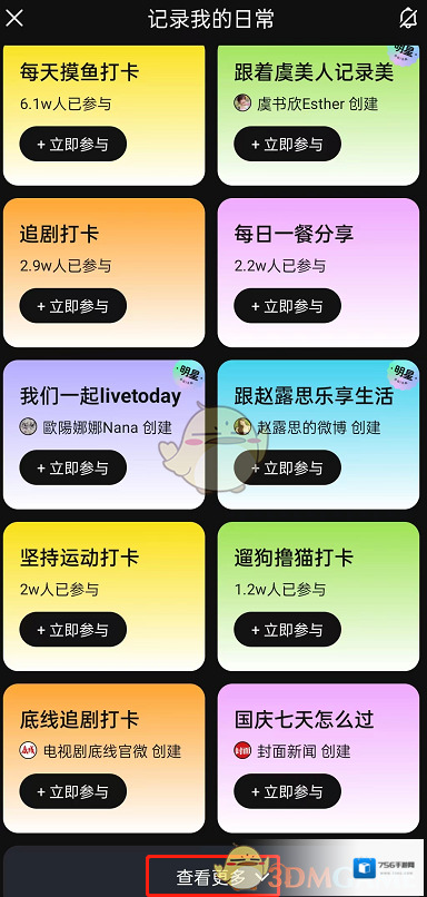 6、回到记录我的日常,点击查看更多。这里还有更多话题,您可以选择喜欢的进行打卡记录。