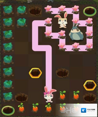 路线2:一切障碍扫除,小粉兔就可以如图连接,顺利地吃完花朵,然后安全回到洞中。