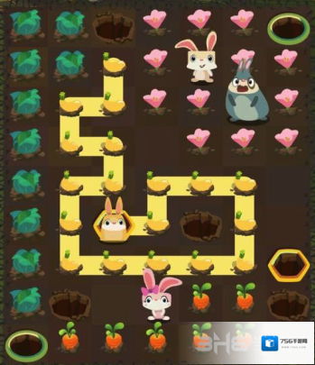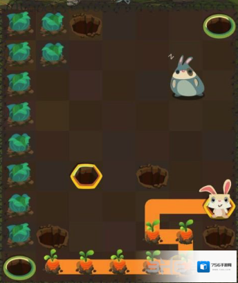路线1:先让小黄兔从面前的黄色的通道中进去,来到萝卜中间。将萝卜从最近的右边连接起来。就可以吃完萝卜,顺利的回到洞中。