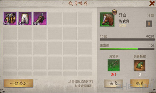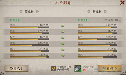 获得心仪的坐骑后,需要对它进行驯养,让坐骑拥有更高的成长。这样,就会给角色带来更高的属性加成。消耗驯马令驯养战马,当属性超过当前属性时,可以选择保存。