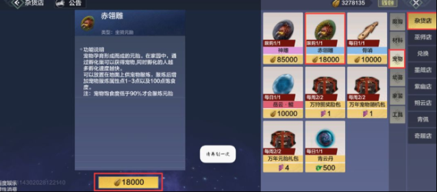 这三种宠物都可用贝币购买,前期完成任务旅者可以轻松攒到一两万贝币,直接购买省心省力。其中白翎雕还可以暂时不买,等待周末的活跃度抽奖活动,几乎必得白翎雕元胎。