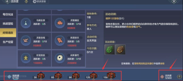 注意,开荒期时,旅者的活跃度日常奖励最好在当日下线前领取,旅者等级高了部分奖励会升级(如活跃度30奖励在20级后会增加灵泉·涤露)。