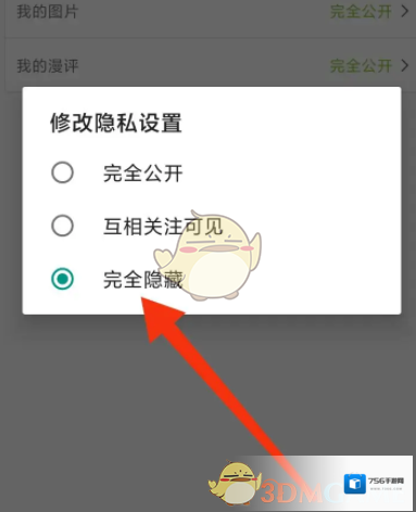 《追追漫画》隐藏收藏漫画方法 2025-07-30 18:04:36 编辑: 蓝色幸福 分类: 应用教程 • 阅读: 621 1、首先在追追漫画个人页点击设置; 2、设置列表选择隐私设置; 3、找到界面我收藏的漫画; 4、弹窗选择完全隐藏即可。 本文内容来源于互联网,如有侵权请联系删除。 追追漫画应用相关内容 全部 追追漫画列表 追追漫画隐私设置 追追漫画 追追漫画收藏 追追漫画隐藏 《追追漫画》添加好友方法介绍 追追漫画加好友的方法步骤 1、用户打开追追漫画客户端后,进入“搜索”栏目,在搜素框内输入漫画名或者是作者名,点击搜索; 追追漫画就可以 2、进入搜索结果详细页面后,用户点击上方的爱心按钮就可以收藏对方了; 追追漫画漫画名 3、如果是金融普通用户的详细... 2025-06-23 发表回复 请登录后评论... 登录后才能评论 评论列表 ( 0条)