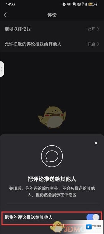 6、最后在页面下面弹出的选项中点击关闭把我的评论推送给其他人即可。