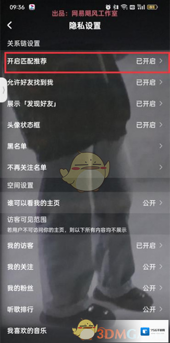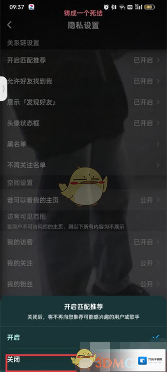 5、在主页隐私设置的页面中选择开启匹配推荐;