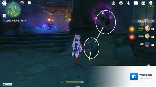 进入屏障内,切换雷元素角色攻击「天狐」雕像,获得卷形的「镇物」后,在屏障内召唤雷种子,走出屏障,前往鸟居