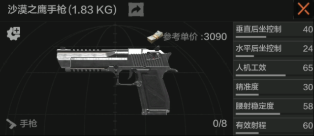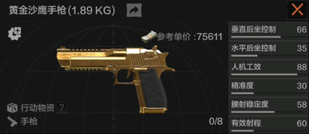 先说说手枪的优点吧。首先,手枪的价格是相当低廉的。比如很受先锋欢迎的手枪沙漠之鹰,使用.44口径子弹,威力惊人,但在市场上的价格却与入门级的冲锋枪差不多。一些更便宜的手枪甚至不到千元,这对于初入暗区、囊中羞涩的先锋们来说就具有很高的性价比了。