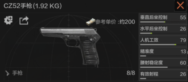 CZ52是终极测试中新增武器的一把手枪,与T54一样使用7.62×25毫米口径弹药,两者的基础属性相差无几。由于目前没有可使用的配件,CZ52是无法通过改装加瞄具,只能使用默认的机瞄。8发子弹的原厂弹匣的续航能力也很有限,通常只能用来对付一下普通游荡者,建议仅开荒使用,有更好武器后将其换下。