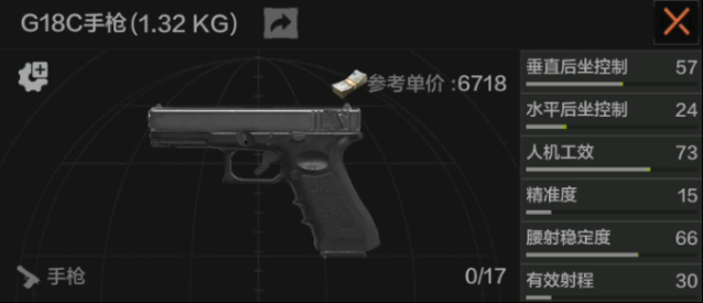 G18C是G17的升级版,主要提升了射速,并增加了全自动开火模式。作为暗区突围中仅有的两把可全自动开火的手枪之一,G18C的火力输出很猛,射速高达1200发/分钟,比P90冲锋枪还快。在全自动开火模式下,默认的17发弹匣,只需要1秒就能打空,火力完全不输冲锋枪。当然高射速的代价就是G18C不太好压枪,因此全自动开火只适用于近距离作战。另外,G18C是无法加装消音器的,使用时动静很大,需要注意。