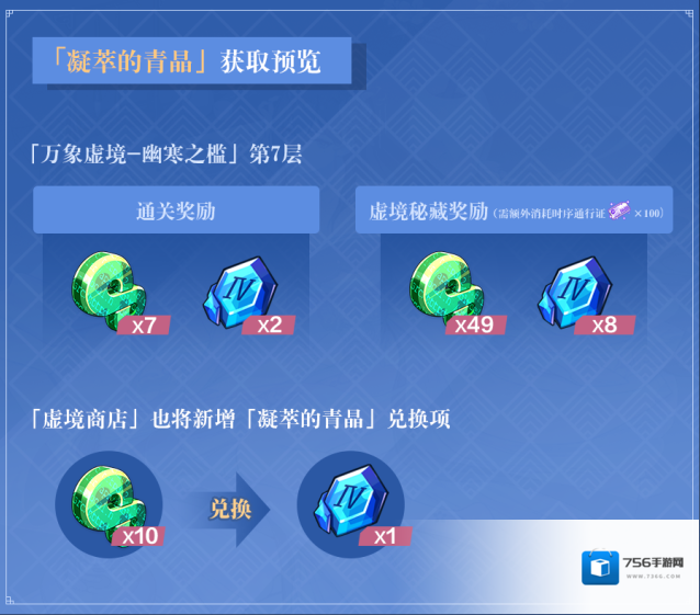 6.1版本更新后,将新增G4冰冻元素伤害圣痕锻造材料「凝萃的青晶」,同时「万象虚境-幽寒之槛」将新增第7层关卡。舰长通关关卡,或在「虚境商店」中使用「以太燃素」兑换,均可获得「凝萃的青晶」。