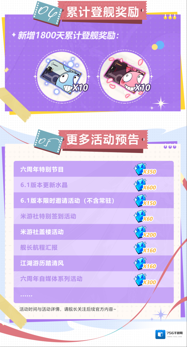 9月23日起,舰长参与系列登录活动,可获得精准补给卡、六周年纪念勋章、自选S级角色、自选补给卡/水晶奖励。