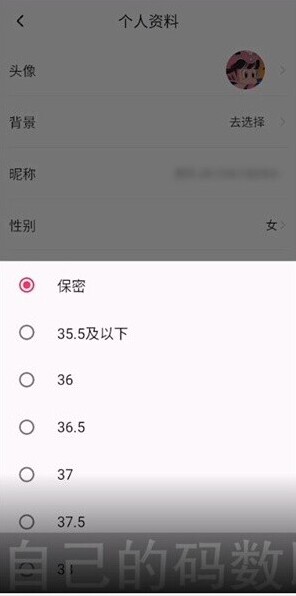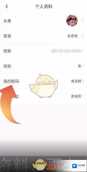 3、进入设置页面后,点击个人资料,再点击我的鞋码;
