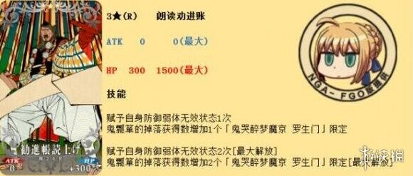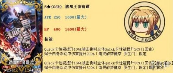 自己的Quick卡性能提升15%+自己被击倒时我方全体的Quick卡性能提升30%(1回合)[最大解放]+自己在鬼哭酔梦魔京 罗生门的攻击威力提升300%[最大解放]