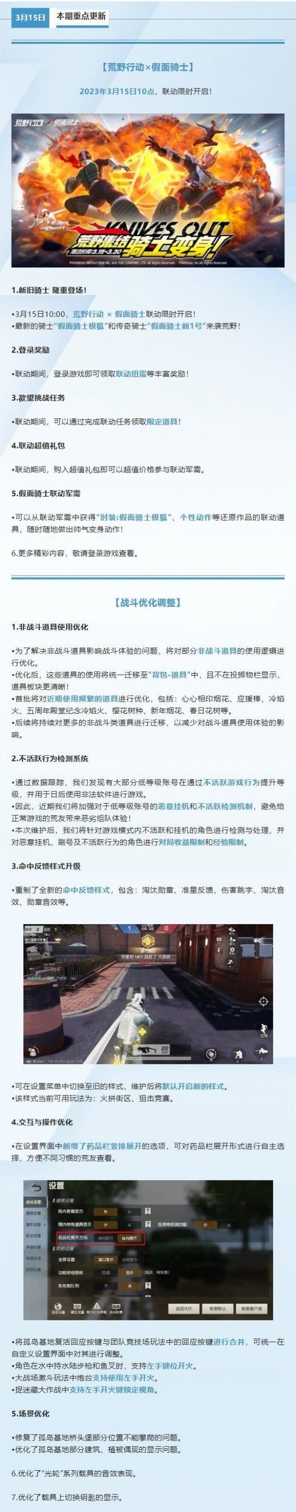 荒野行动×假面骑士联动隆重登场,传奇骑士来袭荒野;多项战斗优化调整,致力于给荒友们提供良好的战斗体验;房间及玩法优化,射击反馈更清晰;时装道具“皇帝的新鞋”免费派送,多款军需重新在殿堂商店上架,可继续兑换!