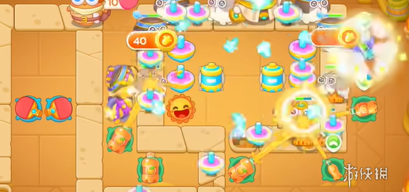3、在下方和右侧建造多个橘子汽水,使用右侧的的炮台攻击上方的方向盘。