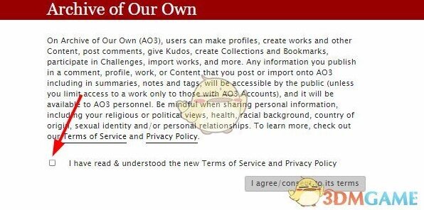 4、最后我们重新刷新网页,然后同意对应的网站条款,就能开始使用AO3网站了。