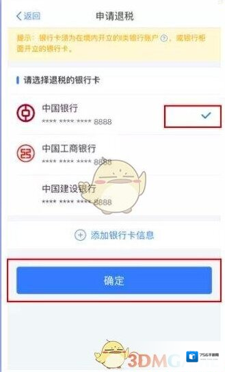 9、点击申请退税后,纳税人需选择退税银行卡。如前期已添加过银行卡,系统将自动带出已填银行卡信息。您需新增,点击添加银行卡信息-确定。