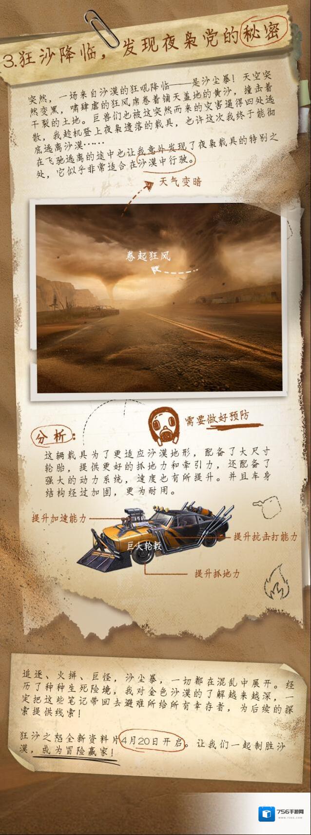追逐、火拼、巨怪,沙尘暴,一切都在混乱中展开。经历了种种生死险境,我对金色沙漠的了解越来越深,一定把这些笔记带回去避难所给所有幸存者,为后续的探索提供线索!