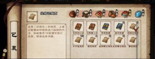 3、等我们获得15张经络论残页后,接着需要点击包袱选项。如下图所示:
