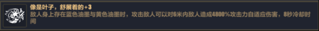 最后才开大招输出并上黄染色,此时蓝黄相遇造成4800%倍率伤害,该伤害就能吃到上面的80%易伤加成,使自身的输出最大化。