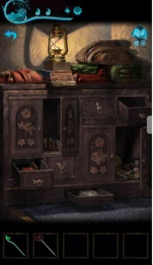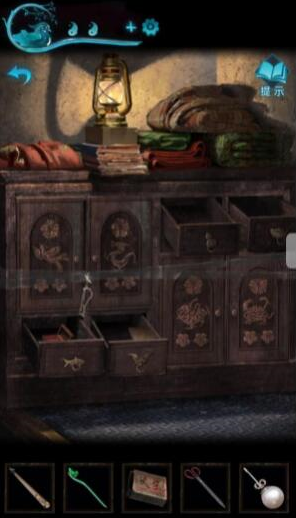 9、我们打开山洞中刚才的房间,进去先翻柜子,即可得到一个珍珠耳环,再用手链将胶带扯开,即可得到神像以及蜡烛。