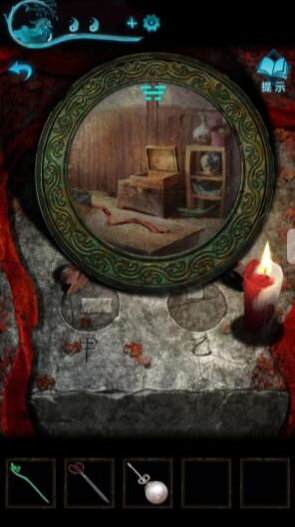 13、我们拿到镜子返回车旁,放上镜子,再把蜡烛放下点上火,接着记住镜子上闪的八卦字符,我们石门打不开就去山上,按顺序打开石块,即可获得箱子以及金贴画。