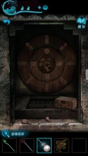 14、我们回石门拿箱子卡住石门,再把贴画贴在最里面的红贴纸旁,然后把珍珠耳环扎在右上角洞上,即可拿到阴阳玉。