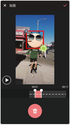 2.在下方栏中选择高级编辑–贴图,然后可以拉动时间轴来选择在哪个时间加贴图,选好时间后,点击正下方的笑脸图案则可以输入贴图了。