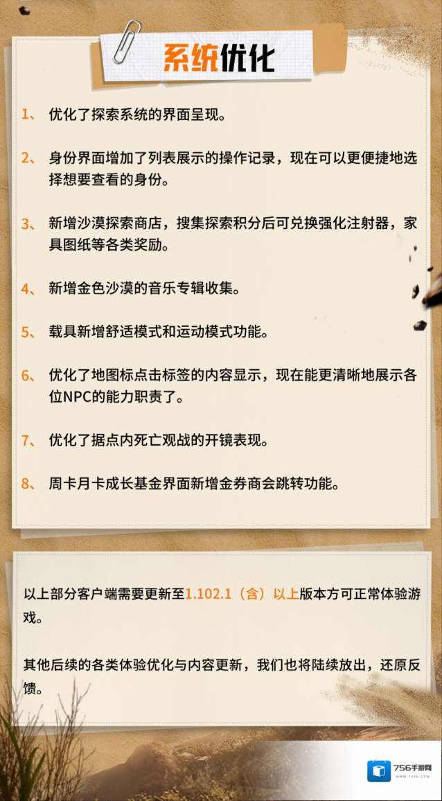 温馨提示:本次维护更新为资料片狂沙之怒相关正式内容,整体下载更新包较大,建议您在WIFI环境下更新,在更新后,幸存者们可领取本次更新维护补偿:金券X2000、银币X20000、典藏券X5,更有相关登录活动奖励免费时装,乐器背包领取。
